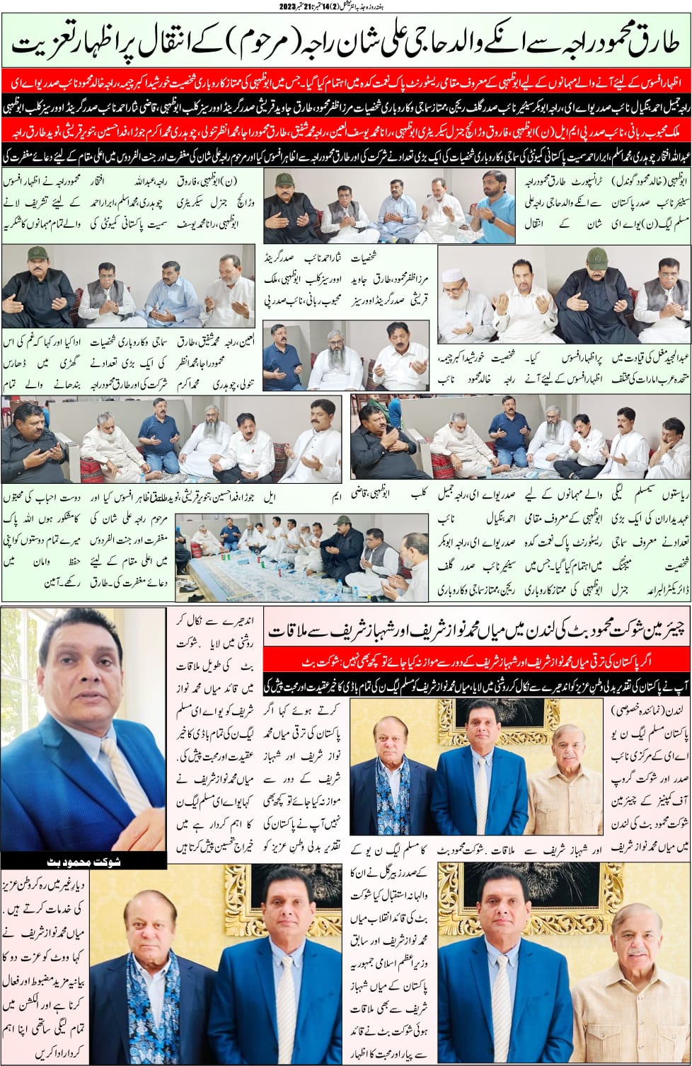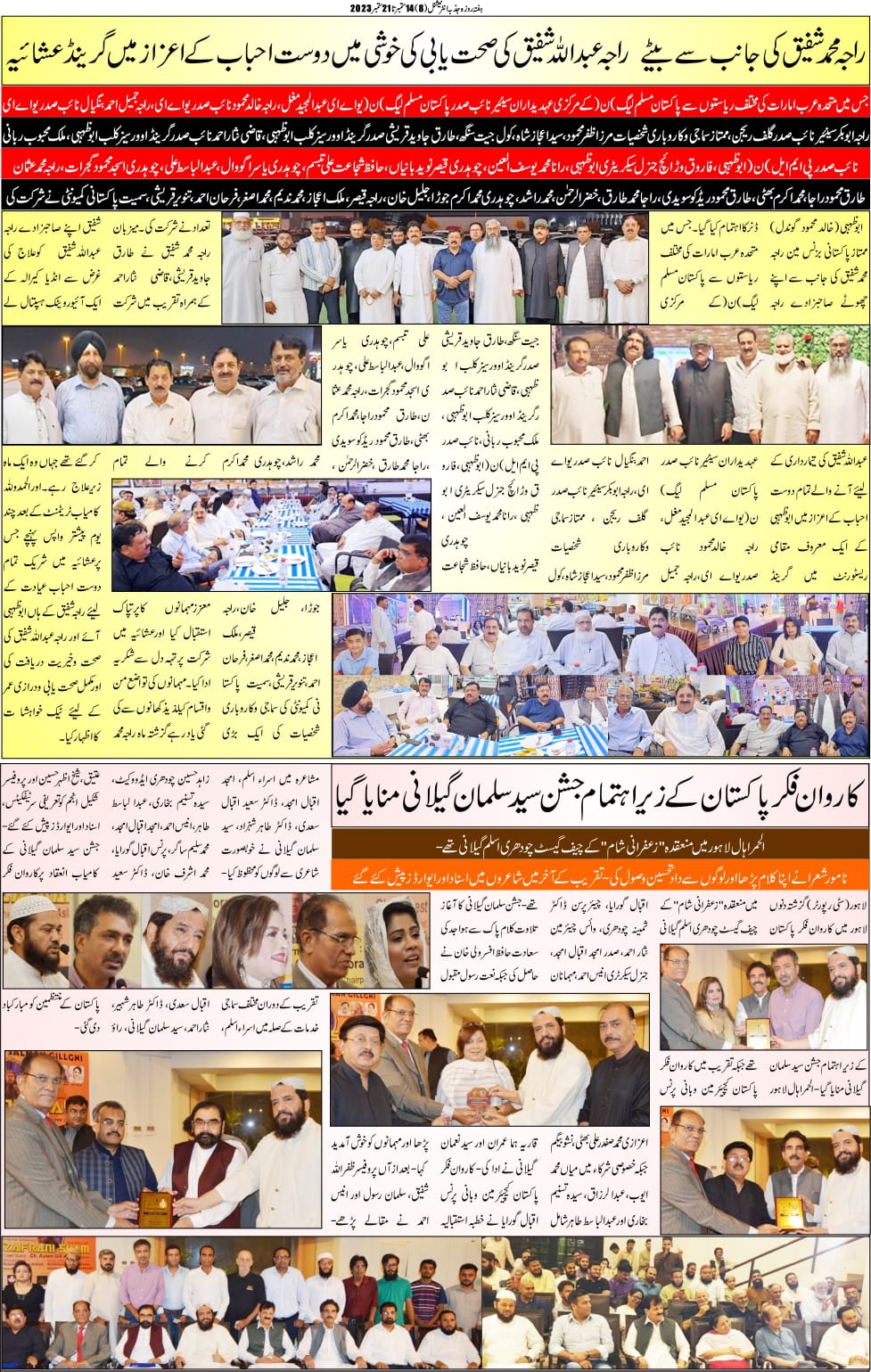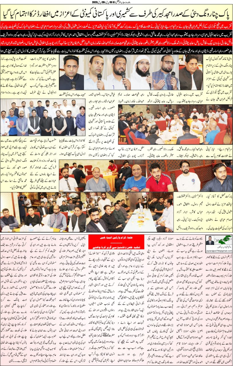 بلال شیخ کی طرف سے دوستوں کے اعزاز میں دی گئی افطار پارٹی میں چیئرمین منیر احمد خان‘ میاں طاہر حمید‘ رانا اشرف‘ میاں محمد اشرف‘ میاں زاہد حمید‘ میاں طارق محمود‘ قاضی عبداللہ‘ شیخ طاہر اور حافظ امیر علی اعوان و دیگر شریک ہیں