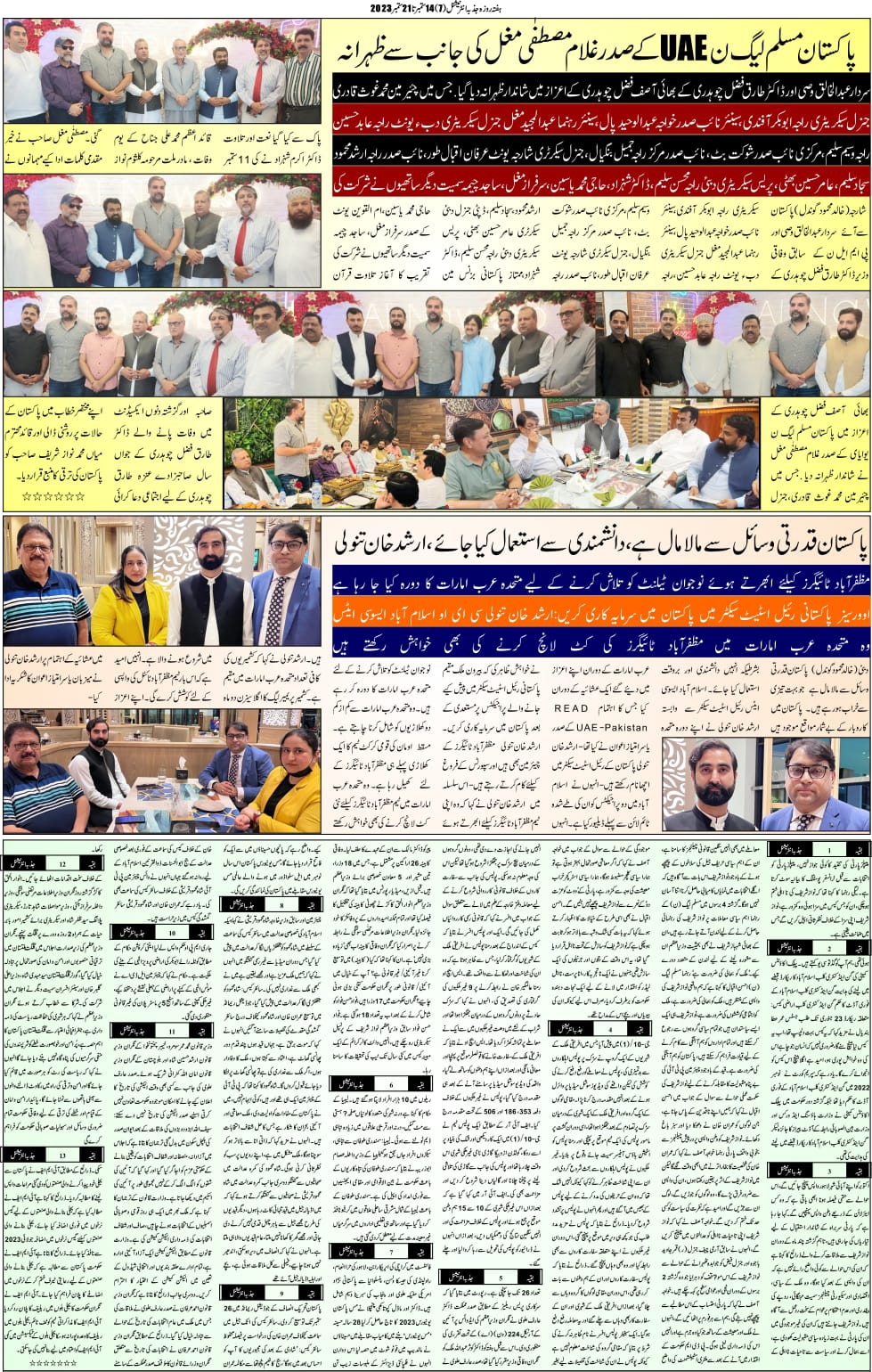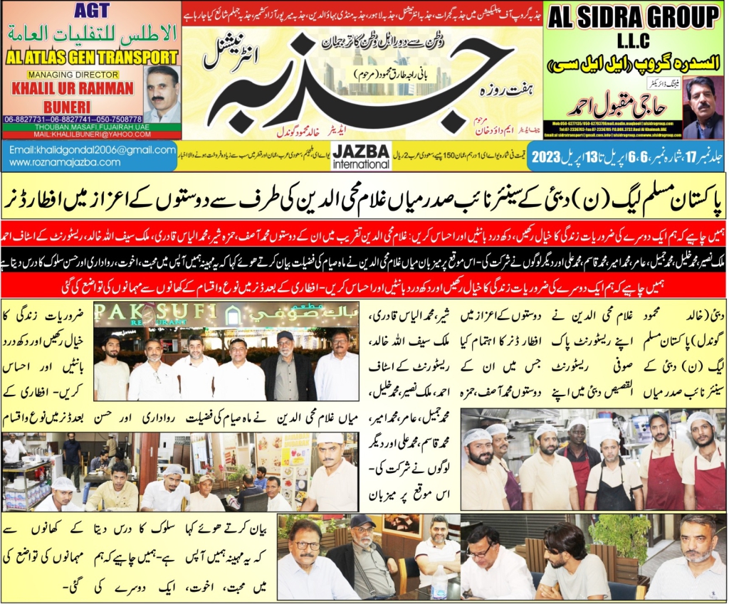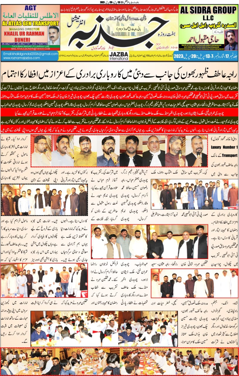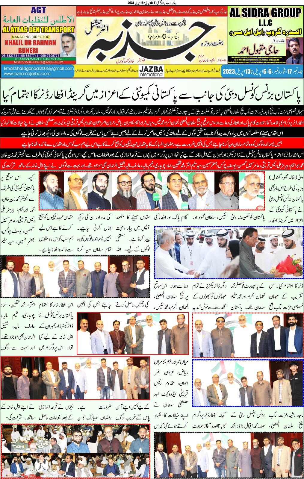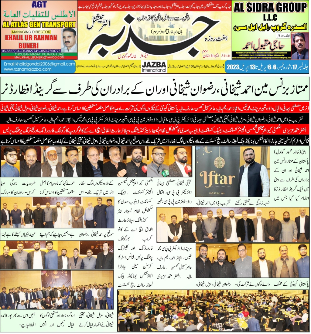 دبئی (طاہر منیر طاہر) انٹیرئیرکمپنی PZA Interiors کے اونر جعفرعباس کی جانب سے دبئی میں کاروباری برادری کے اعزاز میں افطارڈنر کا اہتمام کیا جس میں پاکستانی کمیونٹی کے لوگوں نے شرکت کی- تقریب کے مہمانِ خصوصی ڈپٹی قونصلر جنرل رحیم اللہ خان، ہیڈ آف ایڈوائزری شیخ ماجد راشد المعلا آفس حذیفہ ابراہیم تھے۔ تقریب میں صدر پی ٹی آئی ابو ظہبی محمد ثقلین مہرو، معروف بزنس مین اختر حسین بوٹو، راجہ محمد عثمان، انجینئر فیصل حیات سمیت پاکستانی، ہندوستانی، عربی اور یوروپین ممالک سے تعلق رکھنے والی کاروباری شخصیات نے افطار ڈنر میں شرکت کی۔ حذیفہ ابراہیم نے گفتگو کرتے ہوئے کہا کہ امارات کاروبار کے لیے دنیا کا بہترین ملک ہے اور آپ قوانین کی پاسداری کرتے ہوئے یہاں آزادانہ کاروبار کر سکتے ہیں۔ شرکا نے امارات میں بہتر کاروباری ماحول پر گفتگو کرتے ہوئے اماراتی حکومت کا شکریہ ادا کیا کہ انہوں نے یہاں بہترین کاروباری ماحول فراہم کیا ہے اور ساری دنیا سے سرمایہ کار آ کر یہاں کاروبار کر رہے ہیں۔ میزبان جعفر عباس نے شرکائے تقریب کا شکریہ ادا کیا اور اس عزم کا اظہار کیا کہ وہ امارات میں انٹیرئیر کی فیلڈ میں اپنی پیشہ ورانہ مہارت کے ساتھ امارات کی معیشت میں مثبت کردار ادا کرتے رہیں گے۔