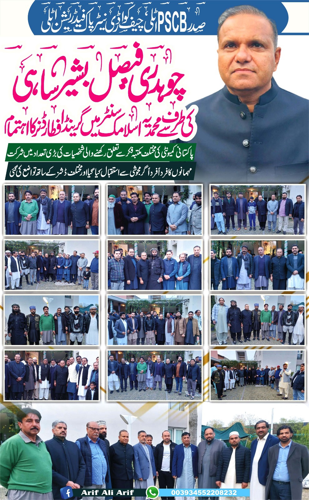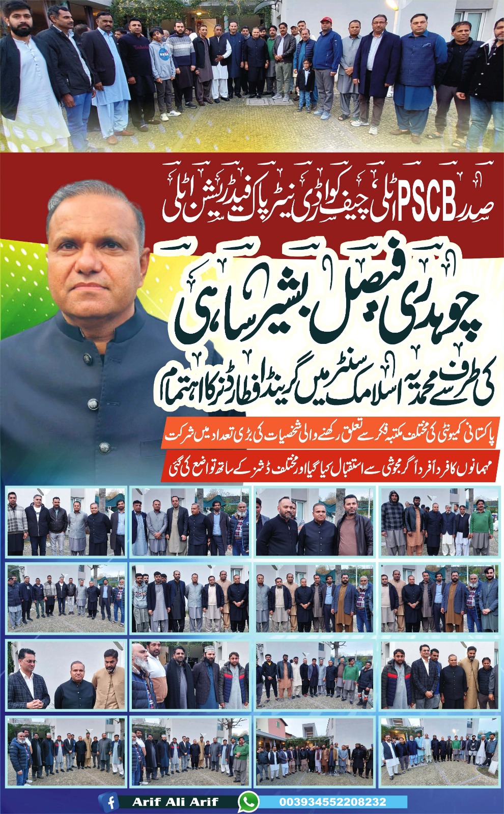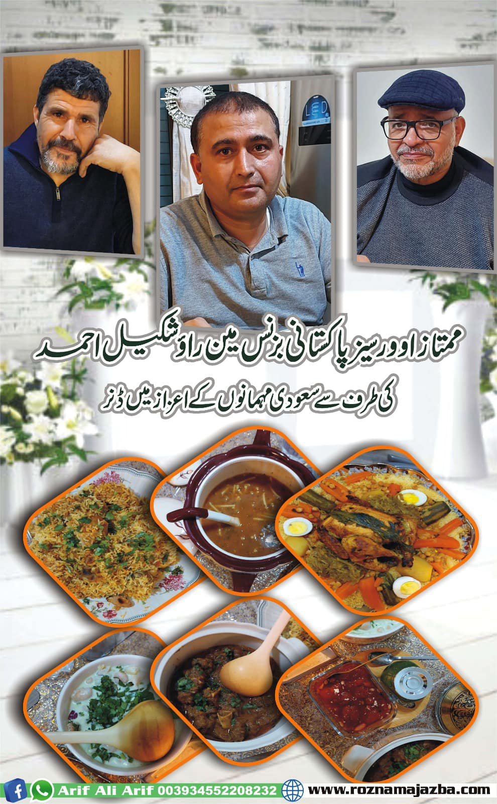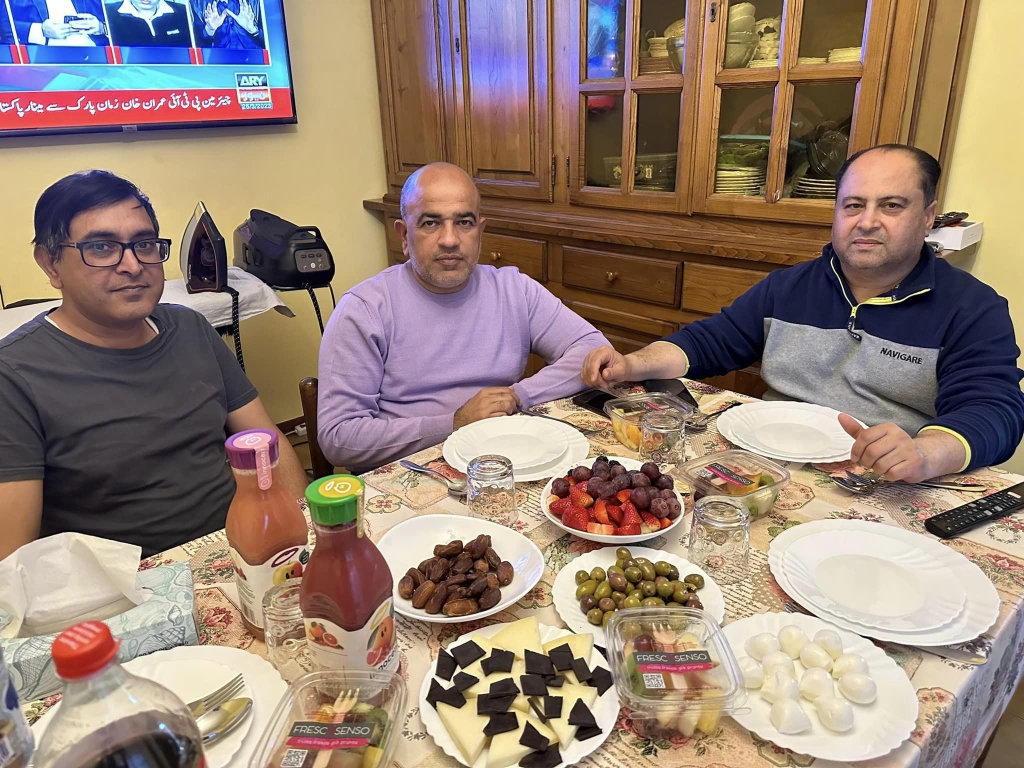 ممتاز بزنس مین پاکستانی کمیونٹی اٹلی آصف منیر پٹھان کی رہائشگاہ پر افطار ڈنر کے موقع پر سابق صدر پاک فیڈریشن اٹلی چوہدری ساجد محمود سانگ ‘ صحافی عارف علی عارف اور محمد علی