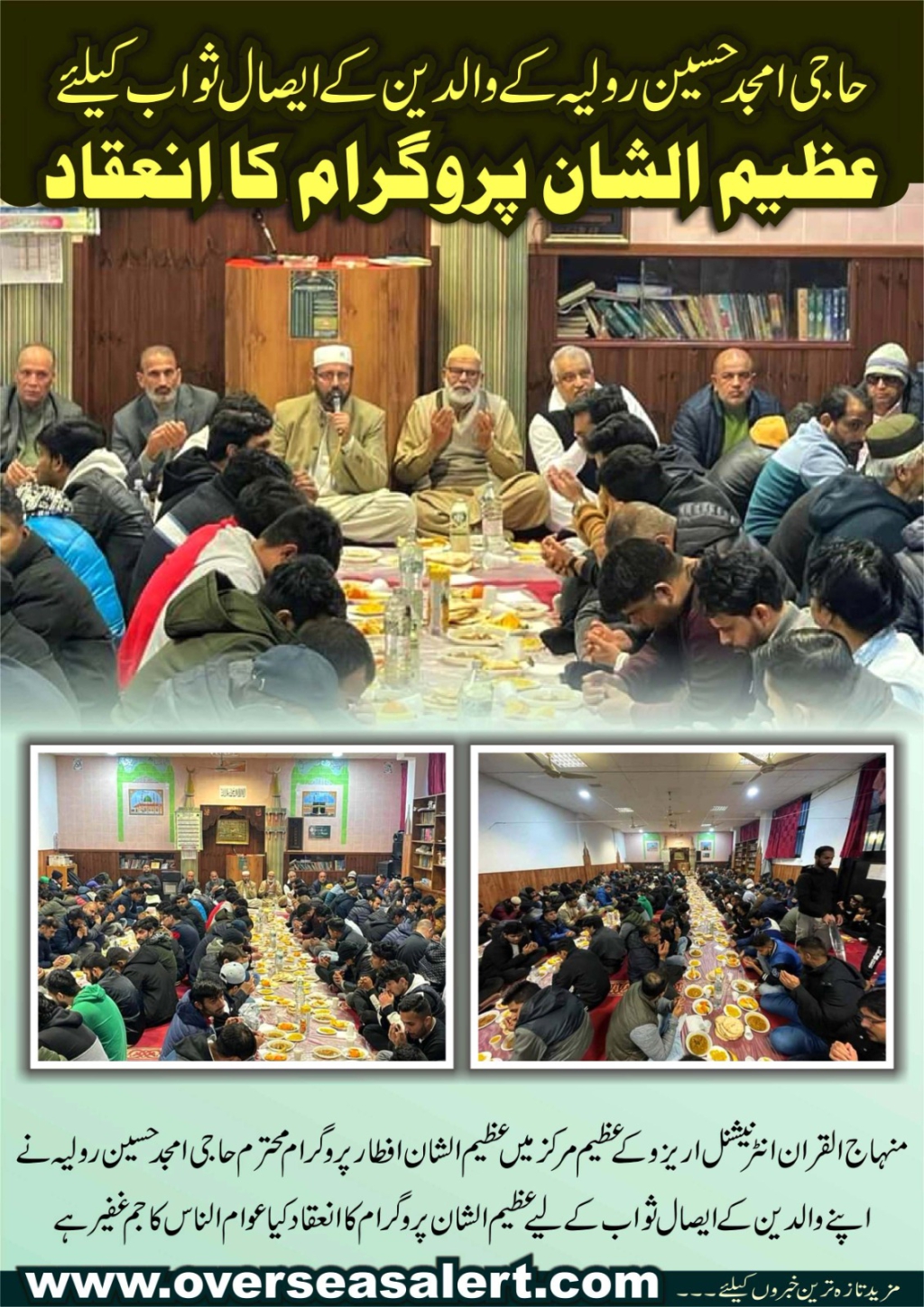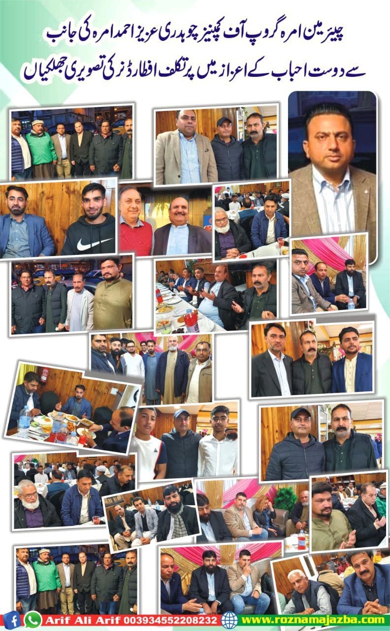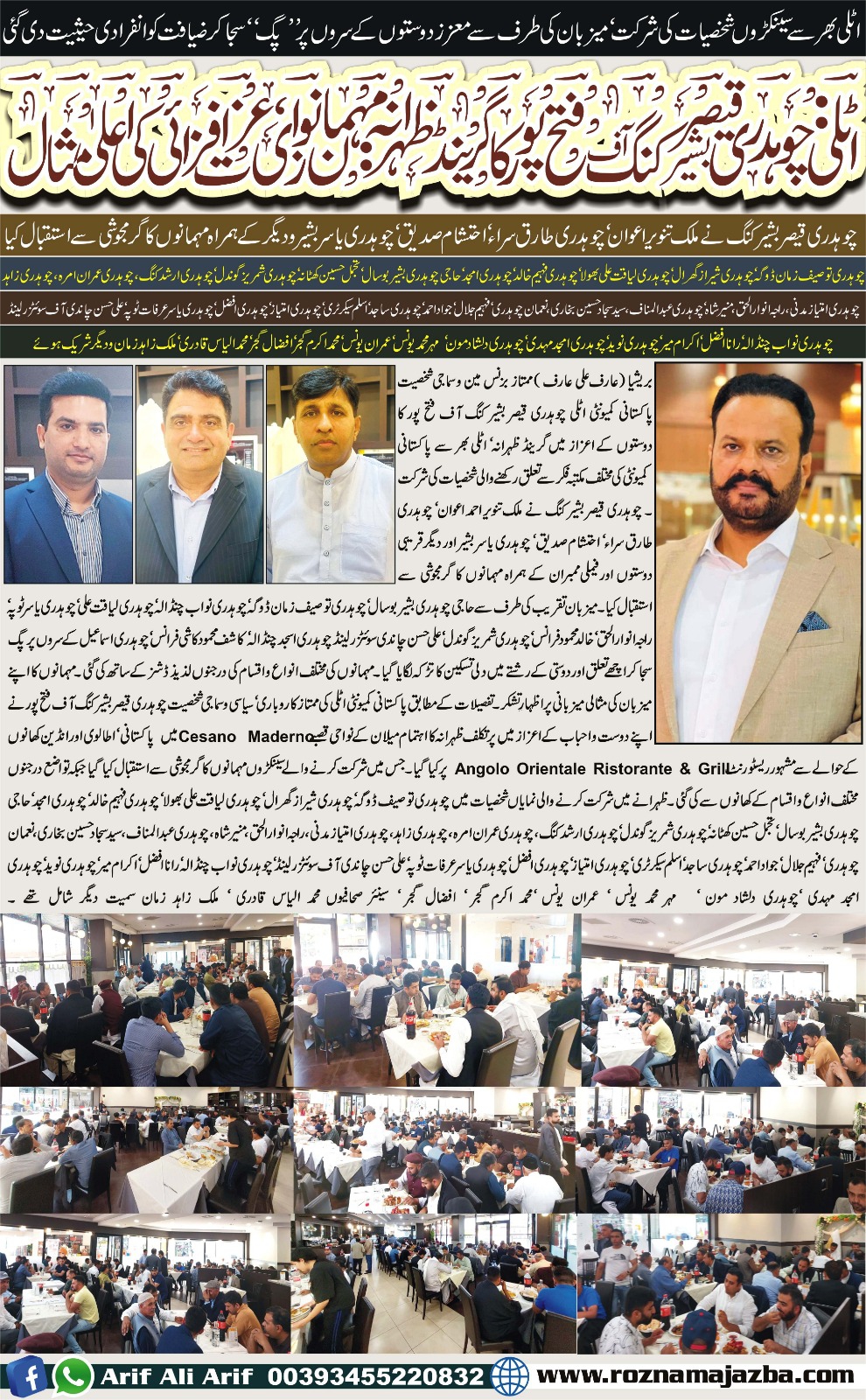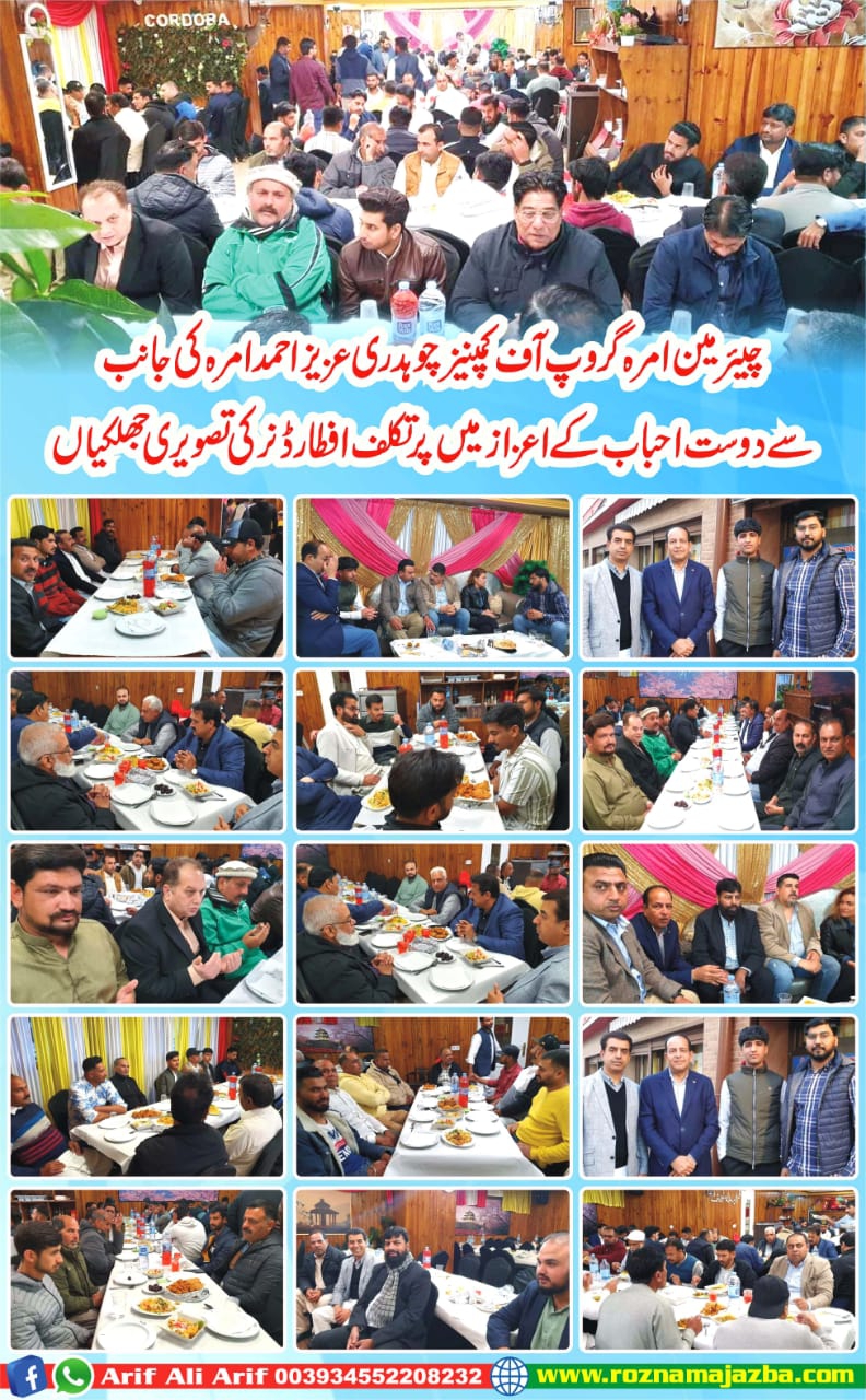 ممتاز اوورسیز پاکستانی چوہدری قمر ٹوانہ اور راجہ عاشق حسین کی طرف سے دئیے گئے افطار ڈنر میں چوہدری اسماعیل سرور بھٹیاں ‘ وسیم شہزاد چوہدری اقبال بھاگو و دیگر شریک ہیں