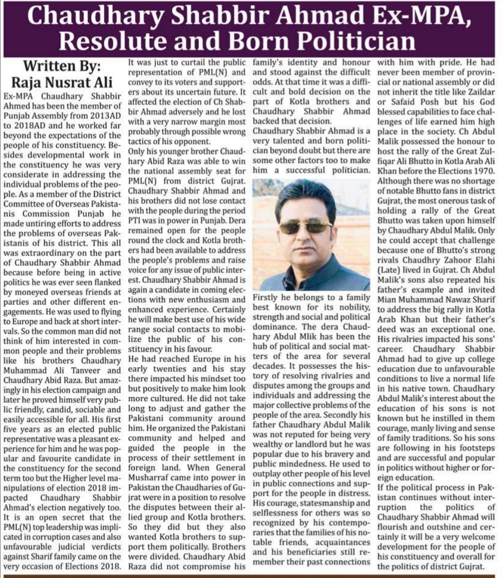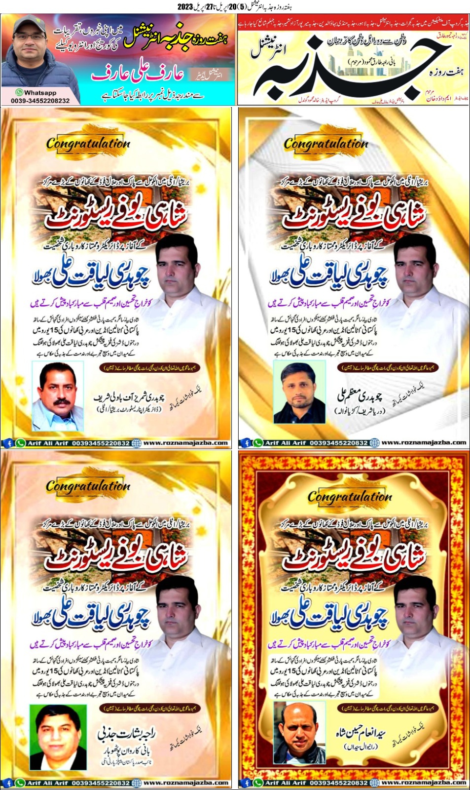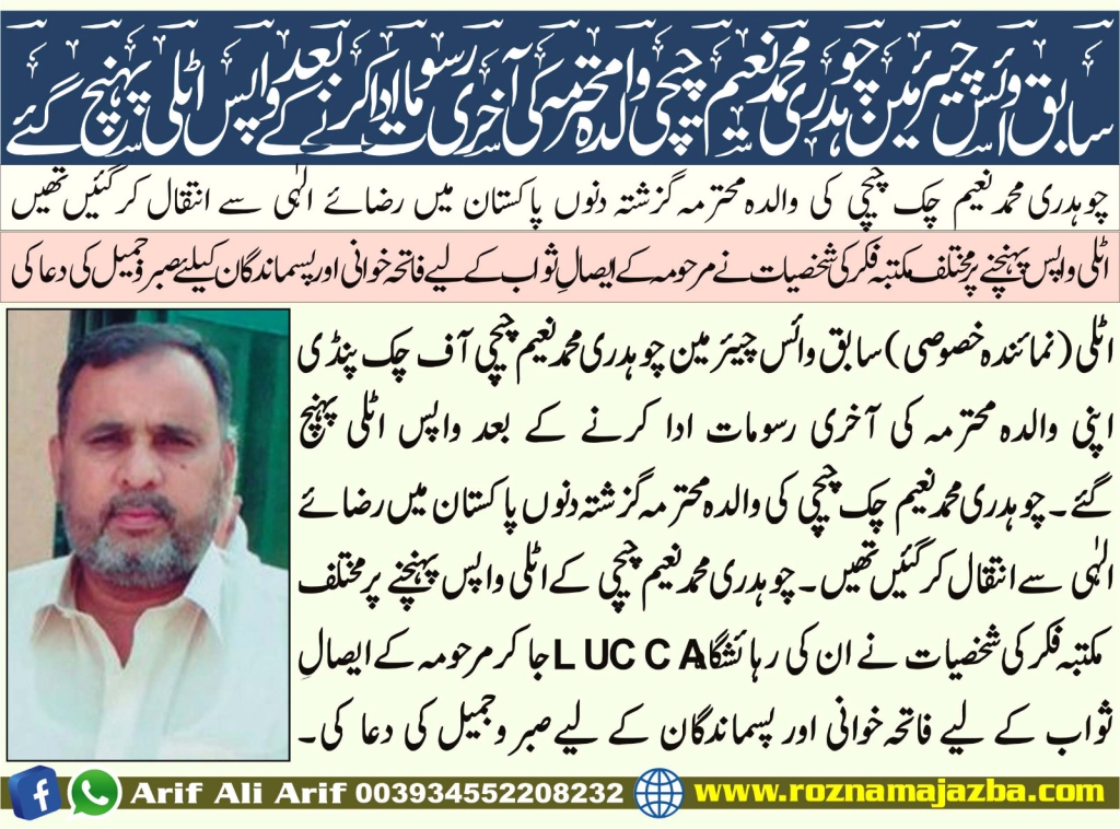 آریزو /اٹلی میں مقیم خوبصورت شخصیت کے مالک عابد حسین چڑیاولہ کسی تعارف کے محتاج نہیں ۔ عاجزی ‘ انکساری اور بے لوث جیسی خوبیوں سے لبریز ہیں ۔بیس سال سے زائد کی پردیس کی زندگی میں اتار چڑھاؤ کے بعد اللہ کے خاص کرم اور والدین کی دعاؤں کی بدولت ایک کامیاب انسان ہیں اور اپنی زندگی نمود و نمائش سے ہٹ کر سادگی سے گزارنے کو ترجیح دیتے ہیں انکے چھوٹے بھائی شکیل احمد اور عقیل احمد اپنے بھائی کے ساتھ خاندانی روایات کو آگے بڑھانے میں ہمہ وقت ان کے شانہ بشانہ کھڑے ہیں ۔ دعا ہے اللہ تعالیٰ ان کو صحت والی لمبی زندگی عطا فرمائے اور وہ خلق ِ خدا کی خدمت اسی انداز میں کرتے رہے جس کی وہ کبھی تشہیر کرنا پسند نہیں کرتے (آمین)