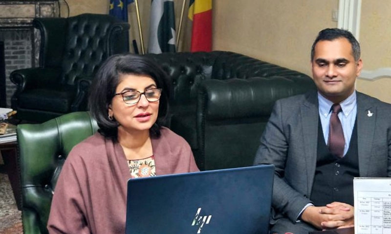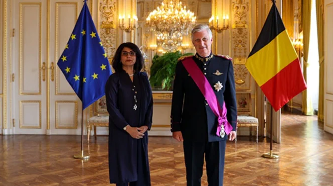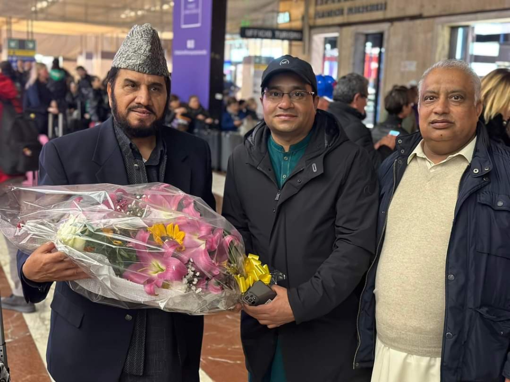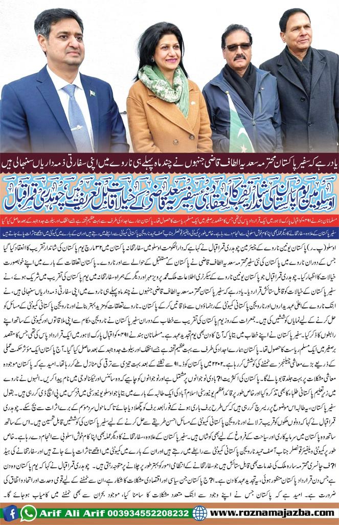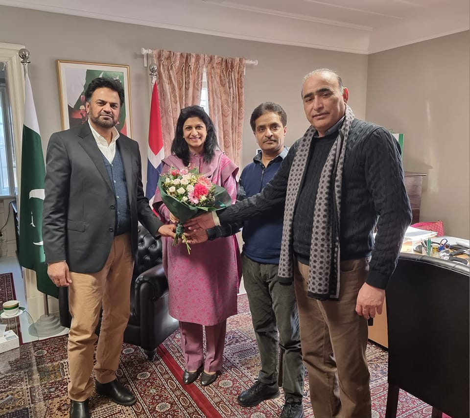 صدر پاکستان کمیونٹی ناروے اظہر اقبال رندھیر ‘ممتاز بزنس مین چوہدری الیاس گھراور غلام رسول ناروے میں پاکستانی سفیر سعدیہ الطاف قاضی کو گلدستہ پیش کر کے ویلکم کر رہے ہیں