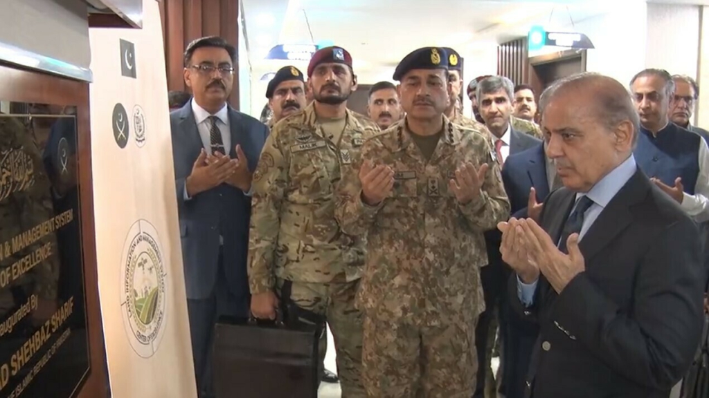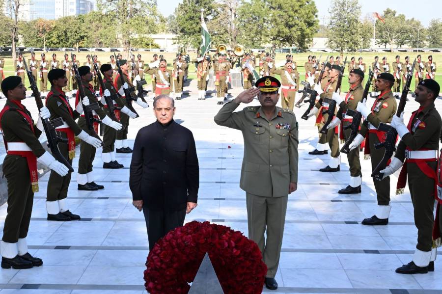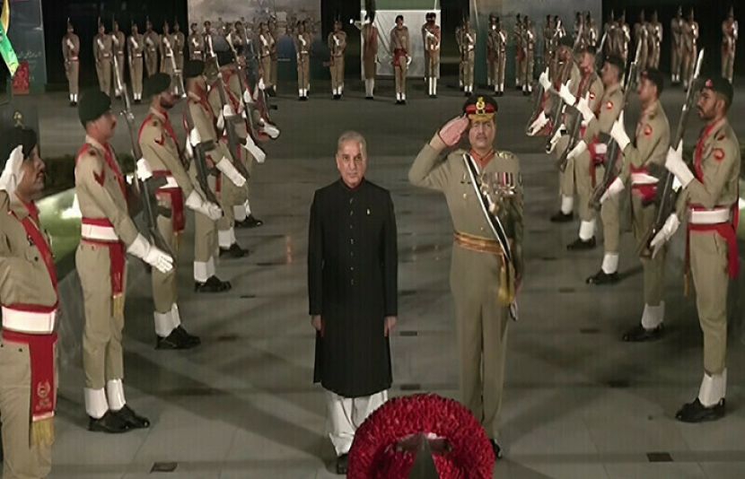 جی ایچ کیو آمد پر وزیراعظم شہباز شریف نے یادگار شہدا پر پھول چڑھائے اور شہدا کے بلندی درجات کے لیے دعا کی۔