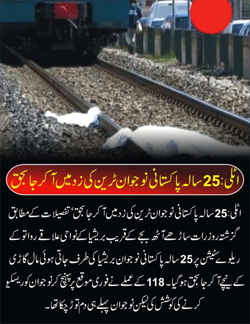 اٹلی میں 16 سالہ پاکستانی قتل،دو زخمی ۔پولیس مصروف تفتیش ,اطالوی میڈیا کے مطابق اٹلی کے شہر مودنہ میں پاکستان اورتیونس سے تعلق رکھنے والے دو گروپوں کے تصادم میں پاکستانی نوجوان لڑکے کو قتل کر دیا گیا ہے اور دو زخمی بھی بتائے جارہےہیں جن کو مقامی ہسپتال میں منتقل کردیا گیا ہے۔