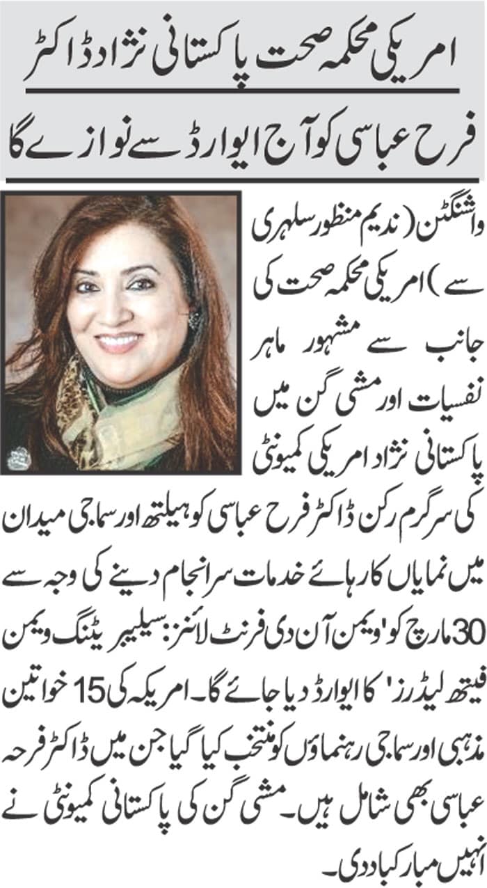 امریکی محکمہ صحت پاکستانی نژاد ڈاکٹر فرح عباسی کو آج ایوارڈ سے نوازے گا